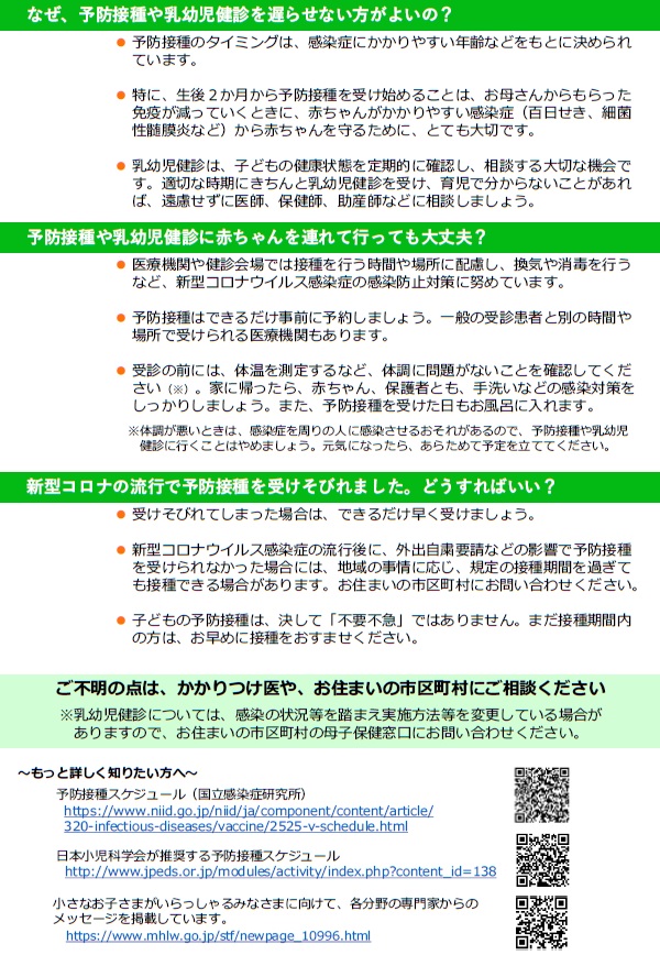 公開日 2020年06月10日 お子さまの健康が気になる時だからこそ、予防接種と乳幼児健診は、遅らせずに、予定どおり受けましょう。 遅らせないで!子どもの予防接種と乳幼児健診.pdf(844KB) お問い合わせ 健康づくり支援課TEL:0293-43-1111お知らせ:健康づくり支援課のお問い合わせフォームはこちら