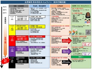 また、市では、災害発生に備え「いつ」、「誰が」、「何をするのか」に着目し、市や関係機関の防災行動やその実施主体を時系列にまとめた「北茨城市洪水対応タイムライン(防災行動計画)」を作成しております。