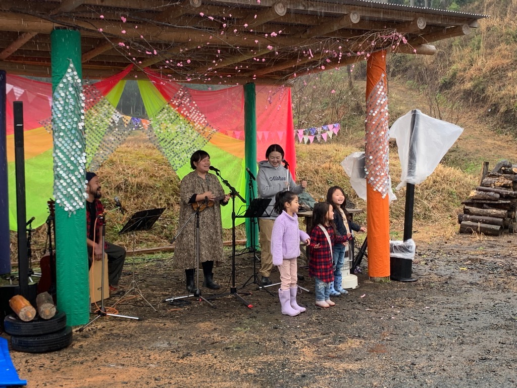石渡さん夫妻は揚枝方地区において、景観そのものを芸術作品(ランドスケープアート)にすることを目的に、地域の皆さんと一緒に桜を植樹するといった景観保全の取組を行っており、今回の春祭は、あいにくの雨でしたが、揚枝方の炭窯広場での野外コンサートと桜の成長を楽しみながら開催いたしました。