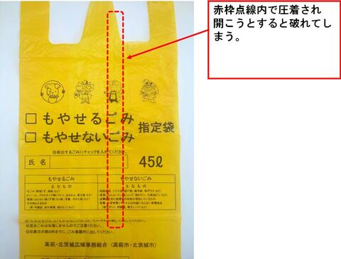 現在、高萩・北茨城広域事務組合(高萩市・北茨城市)指定ごみ袋について、ごみ袋中央部で圧着され袋が開かない等、使用できないものが複数確認されております。
