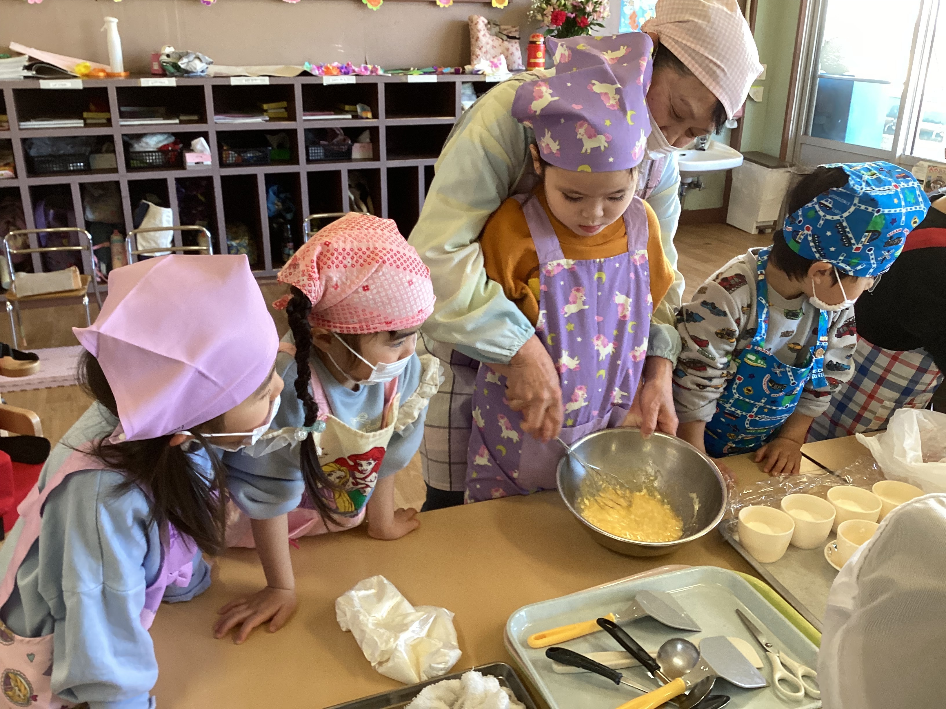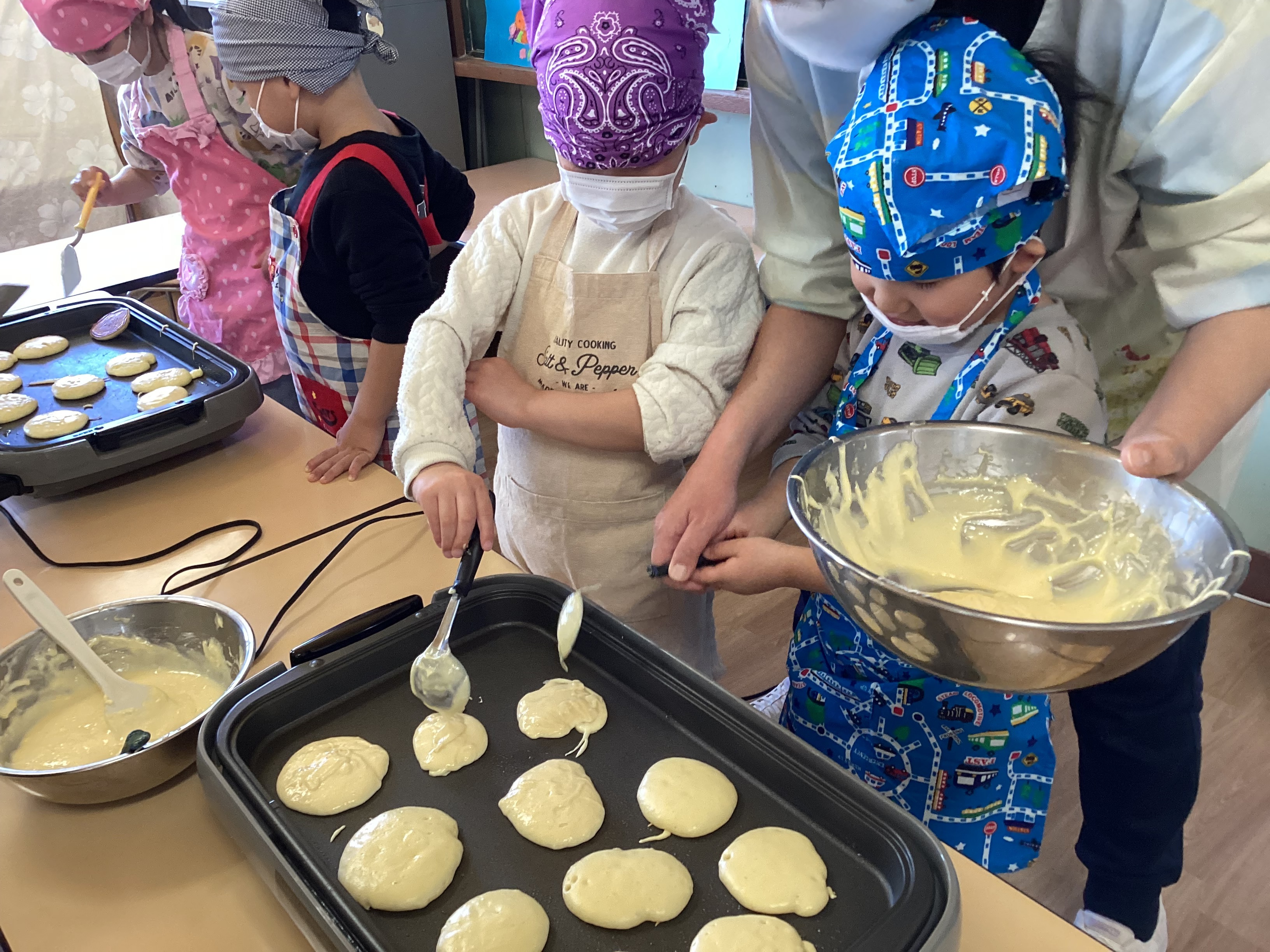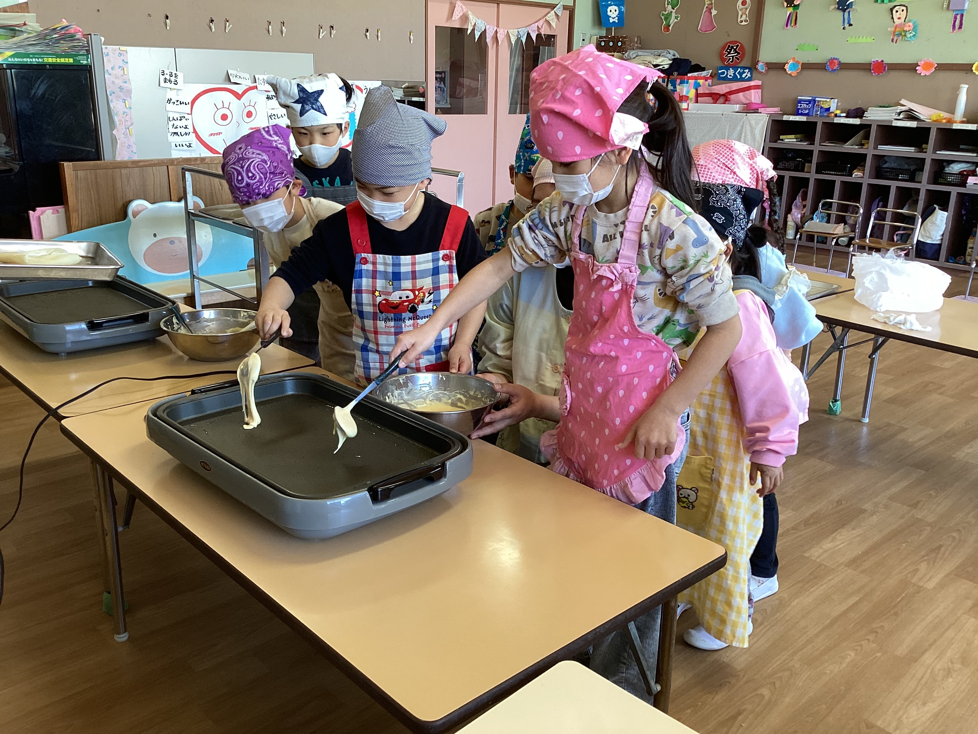 ★3/19(木)つきぐみが、おやつにホットケーキを作ってくれました。卵を割って、粉を混ぜてと「ぐるぐる」「まぜまぜ」、ホイットプレートに気をつけながら焼き上げてくれました。ホップにいちごをのせて美味しく出来上がりました。小さなお友達は「おいいしいね」喜んで食べていました。クッキング1[JPG:2.16MB]クッキング2[JPG:2.18MB]クッキング3[JPG:2.46MB]クッキング4[JPG:2.17MB]クッキング5[JPG:2.31MB]クッキング6[JPG:2.16MB]クッキング7[JPG:2.09MB]クッキング8[JPG:2.21MB]