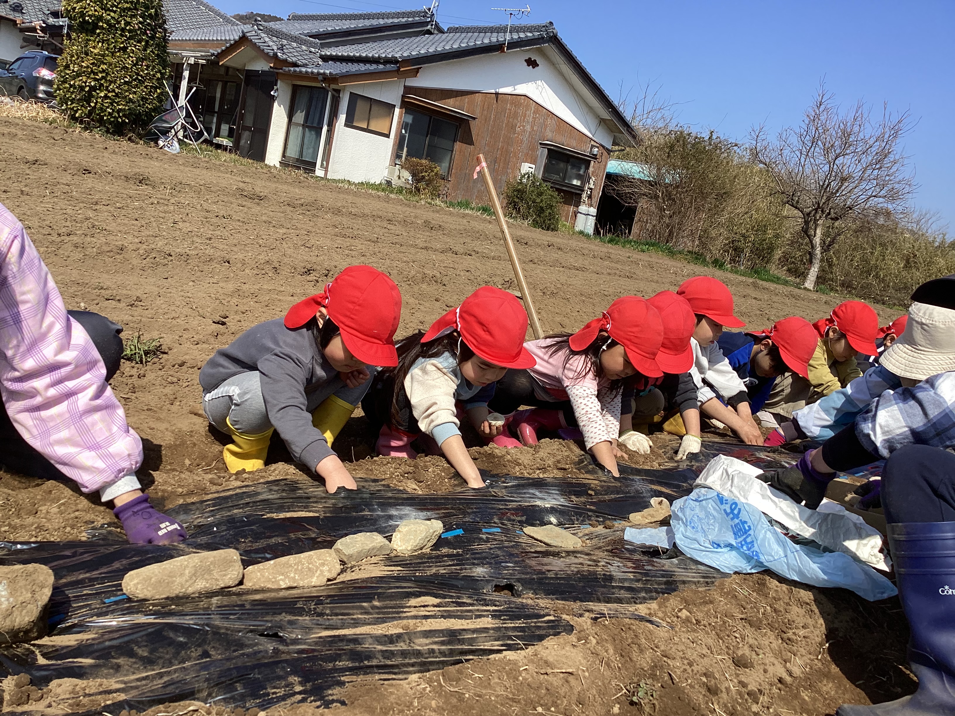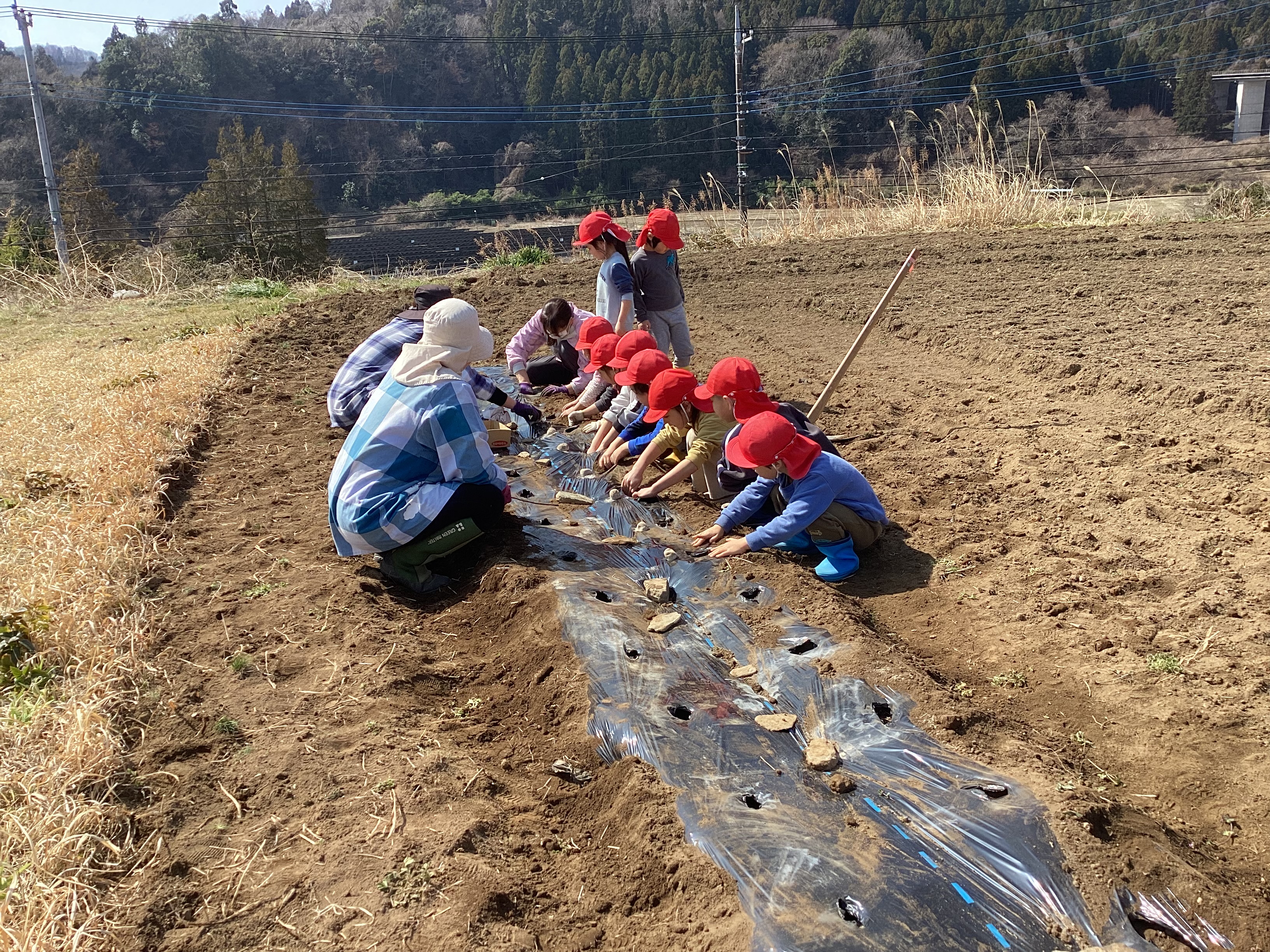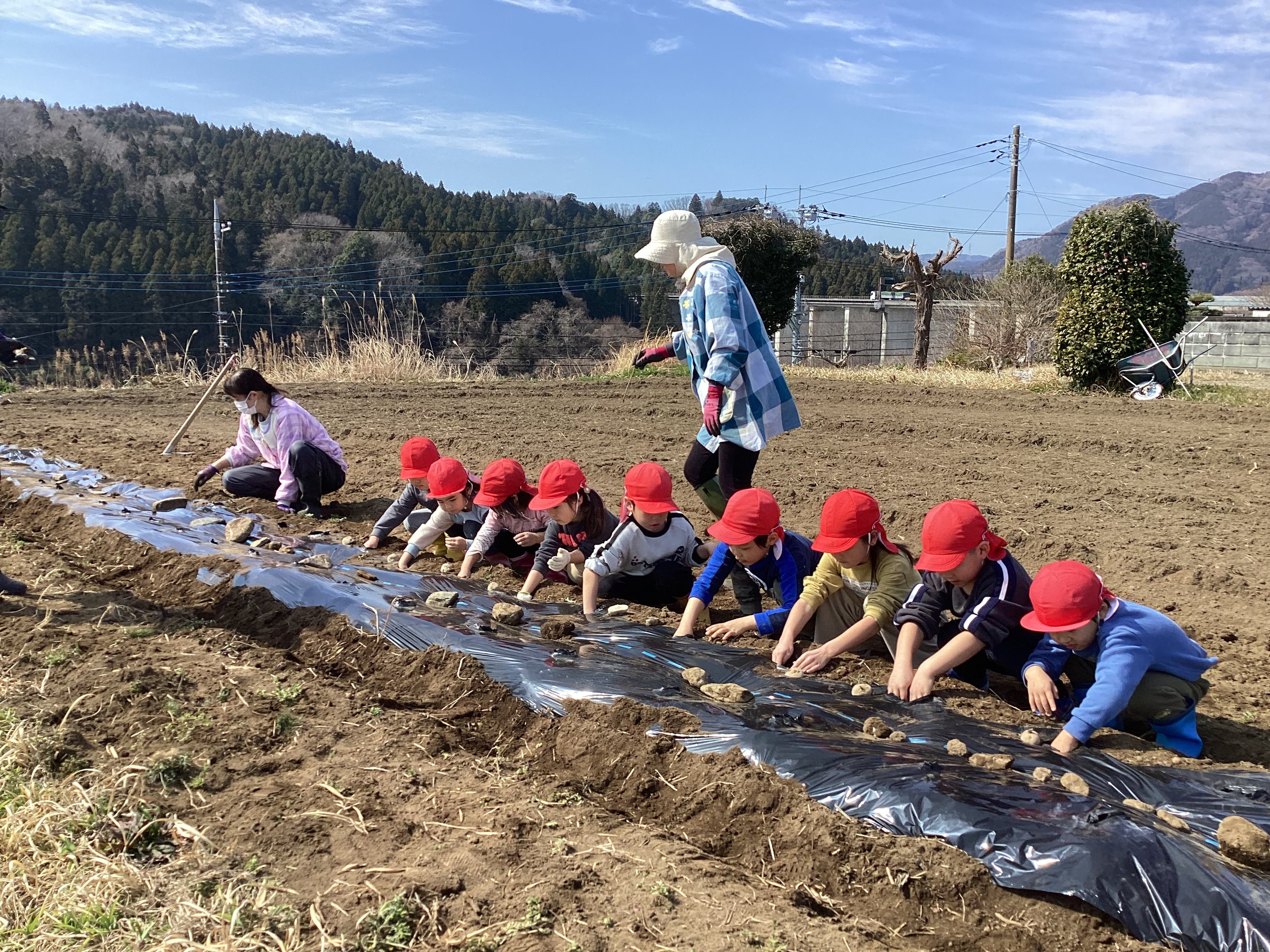 ★3/17日(火)じゃがいも植えをしました。今年も地域の方の畑をかりてじゃがいもの植え付けをしました。就学時は収穫時は、小学生になり食べられないけれど、みんながたくさん食べれるようにと一つ一つ丁寧に土中に入れて、「じゃがいもおおきくなーれ」「いっぱいなーれ」と願いを込めて植えていましたね。じゃがいも植え1[JPG:3.74MB]じゃがいも植え2[JPG:5.08MB]じゃがいも植え3[JPG:5.15MB]じゃがいも植え4[JPG:6.19MB]