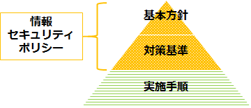 「基本方針・対策基準・実施手順」で構成される情報セキュリティ対策体系のうち、「基本方針」と「対策基準」をあわせたものを、情報セキュリティポリシーと表現しています。